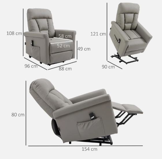 LIFT RECLINER: Built with a powerful motor, this power lift chair raises you out and settles you back down smoothly. A practical chair for the elderly, as well as those with physical limitations.135° RECLINING CHAIR: Relax back at a position you want most. Adjustable for reading, watching TV and relaxing. Built-in footrest raises legs to keep a relaxed body posture. PU LEATHER UPHOLSTERY: Sleek and stylish design. Overstuffed padded makes it super comfortable - sink in with ease - you'll never want to get out!